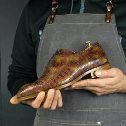 Hand cut from raw high-grade Italian crust leather, shoe patterns are engraved with beautiful Egyptian hieroglyphic motifs. Applying natural dyes and oils -and lots of savoir-faire- our Maestro colorist achieves this unique and staggering look that we call "Museum" Patina. After much hand brushing and polishing, the glacé effect is jaw-dropping, as you can see on the pictures.