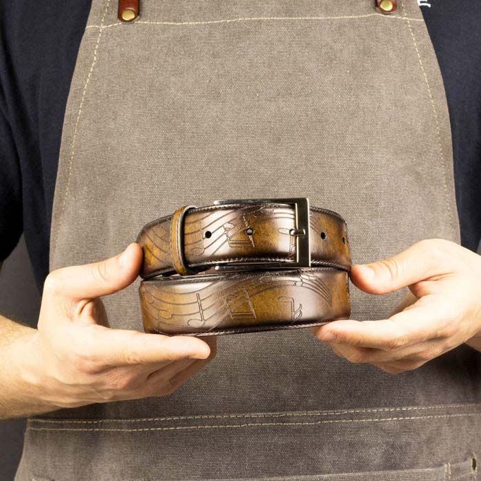 A classic belt suitable for any occasion. The Hampton features timeless stitching and hardware for a clean, sleek, minimal look. It features a music inspired pattern, which is laser engraved on the crust calf leather.